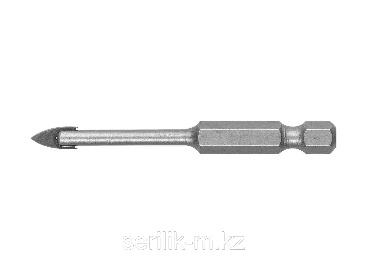 Сверло по кафелю и стеклу 5 мм ЗУБР 29840-05, МАСТЕР, с двумя режущими лезвиями Сверло по кафелю и стеклу 5 мм ЗУБР 29840-05, предназначено для сверления отверстий в стекле, керамической и кафельной п еще→литке. Наконечник сверла из твердого сплава BK6. Специальная заточка режущих кромок улучшает прохождение материала. Шестигранный хвостовик для предотвращения проворачивания в сверлильном патроне. Специальная проточка хвостовика 1/4" для использования быстросъемных адаптеров. Характеристики: Бренд - Зубр. Артикул - 29840-05. Хвостовик - Шестигранный с проточкой хвостовика 1/4". Диаметр - 5 мм. Длина сверла - 75 мм. Тип - Сверло по кафелю и стеклу. Количество режущих кромок - 2.