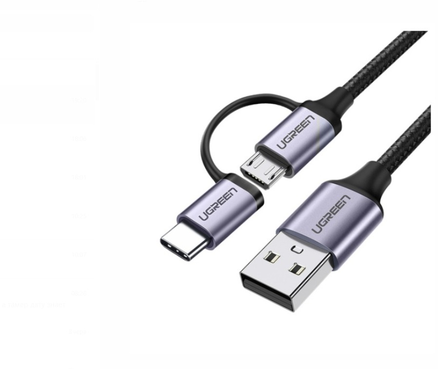 Кабель UGREEN US177 (30875) USB-A to Micro USB + USB Type-C длиной 1 м, черного цвета, предназначен для зарядки и синхронизации данных, поддерживает скорость до 480 Мбит/с, зарядку USB-C до 3A (макс еще→.) и Micro USB до 2A (макс.), совместим с QC3.0/AFC/FCP, выполнен из алюминиевого сплава с нейлоновой оплеткой, совместим с устройствами, такими как Nokia N1 tablet, One Plus 2 и другие с выходом Type C.