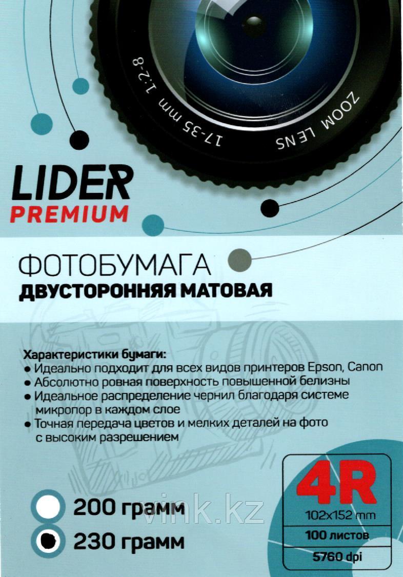 Двухсторонняя матовая, 4R, 230 гр, LIDER Данная фотобумага, идеально совместима со всеми принтерами HP, Epson, Canon. В упаковке 100 листов.