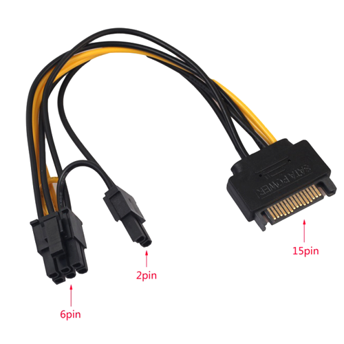 14 дней Разъем питания 6+2pin для видеокарты PCI-E из разъема питания SATA. Длина 0.15м. Характеристики Разъемы: SATA Male(папа)6+2pin(PCI-E) Male(Папа) Длина 0.15м. Вес с упаковкой: 19г Вес:16,8r