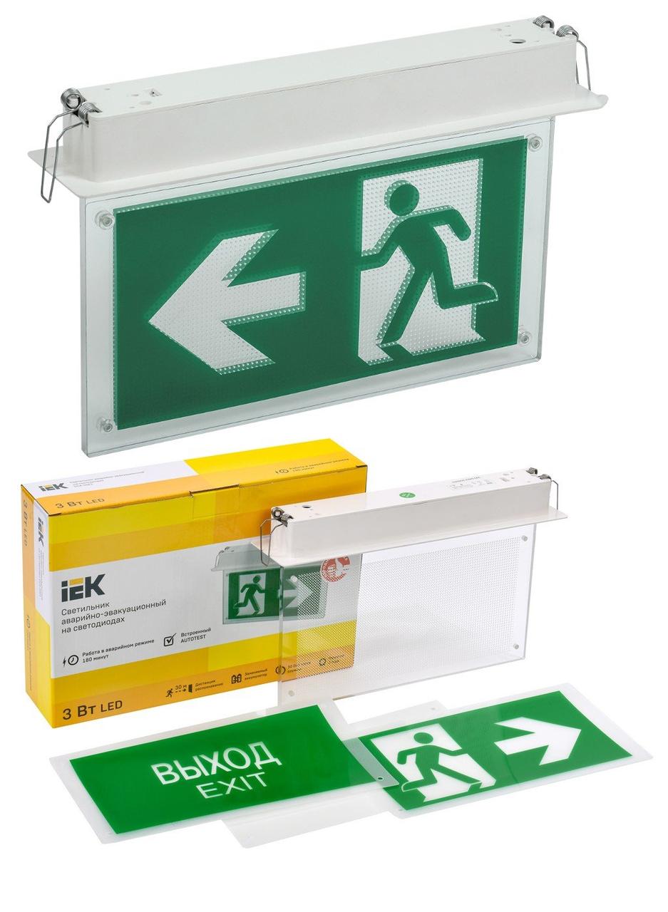 Назначение изделия Предназначен для указания путей эвакуации, мест выхода, направления движения и прочих информационных целей в общественных и административных помещениях с низким уровнем содержания п еще→ыли и влаги. Знаки сменные. Встраивается в потолки типа Армстронг. Двусторонний эвакуационный светильник с возможностью смены знака. Три сменных знака в комплекте: выход, выход