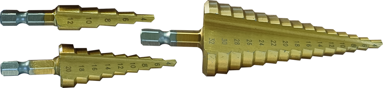 Ступенчатое сверло (сверло "ёлочка") – инструмент со ступенчатым переходом между меньшим и большим диаметрами. Благодаря плавному переходу можно постепенно увеличивать диаметр отверстия, сверлить в ма еще→териалах толщиной до 4-5 мм. Ступенчатые сверла используются для удаления заусенцев, сверления круглых отверстий, отверстий различного диаметра одним сверлом, рассверливания уже имеющихся отверстий.