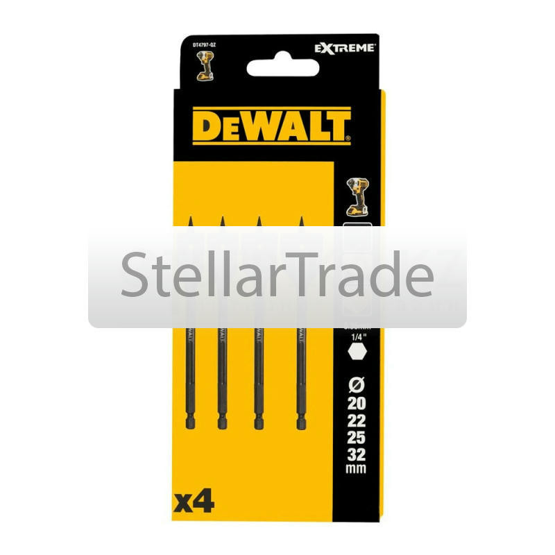 DT4797-QZ - набор из 4 плоских ударных сверл по дереву DeWALT серии EXTREME IMPACT. Модель предназначена для использования с безударными дрелями, а также с сетевыми и аккумуляторными отвертками, обе еще→спечивая точное и чистое сверление в дереве. Преимущества модели Полированный центрирующий наконечник позволяет точно позиционировать сверло во время сверления. Скошенные