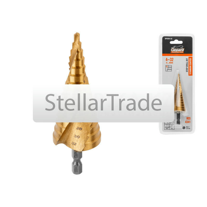 --- Технические характеристики: Назначение: для сверления отверстий различного диаметра 4-6-8-10-12-14-16-18-20-22-24-26-28-30-32 мм в листовых металлических и пластиковых ма еще→териалах толщиной до 5 мм без перестановки режущего инструмента, Материал сверла: быстрорежущая сталь HSS 4341 (Р4М3), Профиль: спиральный, Покрытие: нитридтитановое, Тип хвостовика: