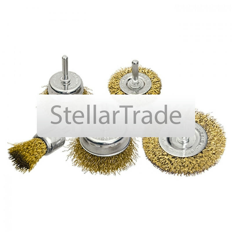 Набор металлических щеток изготовлен из стальной проволоки.Латунное покрытие.Применяется для очистки металлических поверхностей от ржавчины и грязи в щадящем режиме. Характеристики MATRIX еще→74492 Диаметр хвостовика 6мм Диаметр внешний 0м _Длина в упаковке 255мм Количество в наборе 5 Максимальный диаметр 75мм