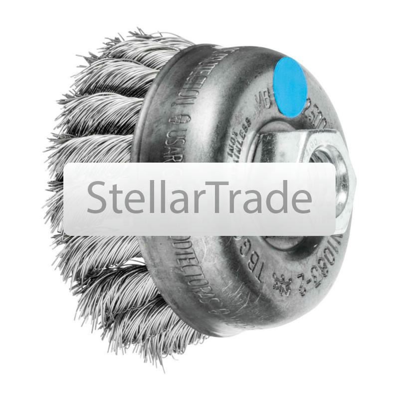 Чашечная щётка с резьбой, плетёная из нержавеющей проволоки. Для работ высокой жёсткости на относительно больших площадях, устранение заусенцев, очистки и удаления ржавчины. еще→Агрессивная щётка. Благодаря опорным кольцам проволока постоянно находится в пучке. По мере износа необходимо удалить опорное кольцо для дальнейшего, полного использования