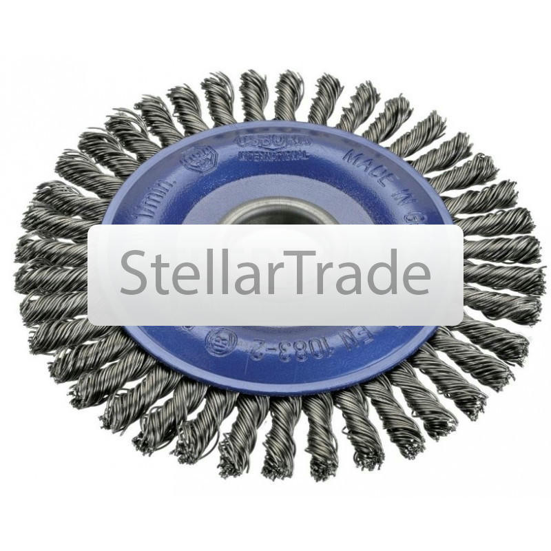 Щетка дисковая D150x6 Metal OSBORN 9906026501 Жгутовая стальная проволока. Щетки дисковые жгутовые на УШМ (болгарка) для тяжелых зачистных работ по изделиям из черной стали, выполняют агр еще→ессивную и эффективную зачистку благодаря витой скрученной в толстые жесткие жгуты стальной проволоки. Корщетки предназначены в основном для обработки прямых лицевых сварных швов, снятие окалины, ржавчины и подобных работ. Характеристики OSBORN 9906026501: Производитель OSBORN Диаметр 150 мм Материал проволоки Сталь нержавеющая Назначение Для чёрной стали