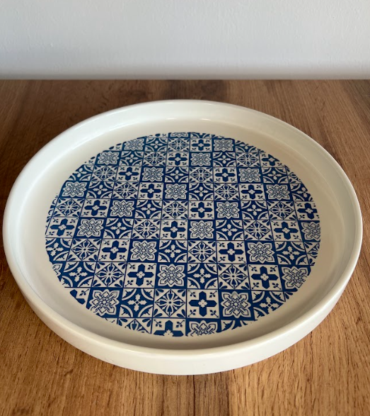 Тарелка синяя Керамическая тарелка с бортом диаметром 26 см выполнена в крафтовом стиле и украшена глубоким синим принтом коллекции «Мозайка». Матовая поверхность подчеркивает элегантность и оригиналь еще→ность посуды. Тарелка удобна для подачи вторых блюд, гарниров и пасты. Стильный дизайн отлично впишется в современную сервировку и создаст акцент на столе.