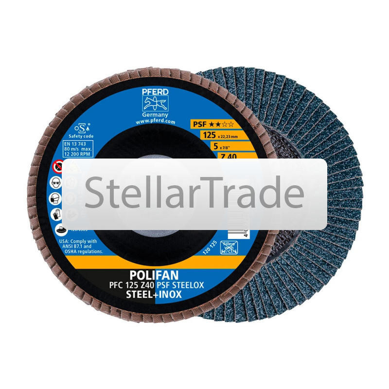 Веерный шлифовальный круг PSF-Z 125x14x22,23 мм, зерно 40 - универсальный инструмент с повышенными требованиями, предназначенный для обработки сварных швов и кромок на стали и нержавеющей стали. Агр еще→ессивная характеристика обработки обеспечивает высокую производительность съёма материала при использовании мощных углошлифовальных машин с повышенным прижимным усилием.