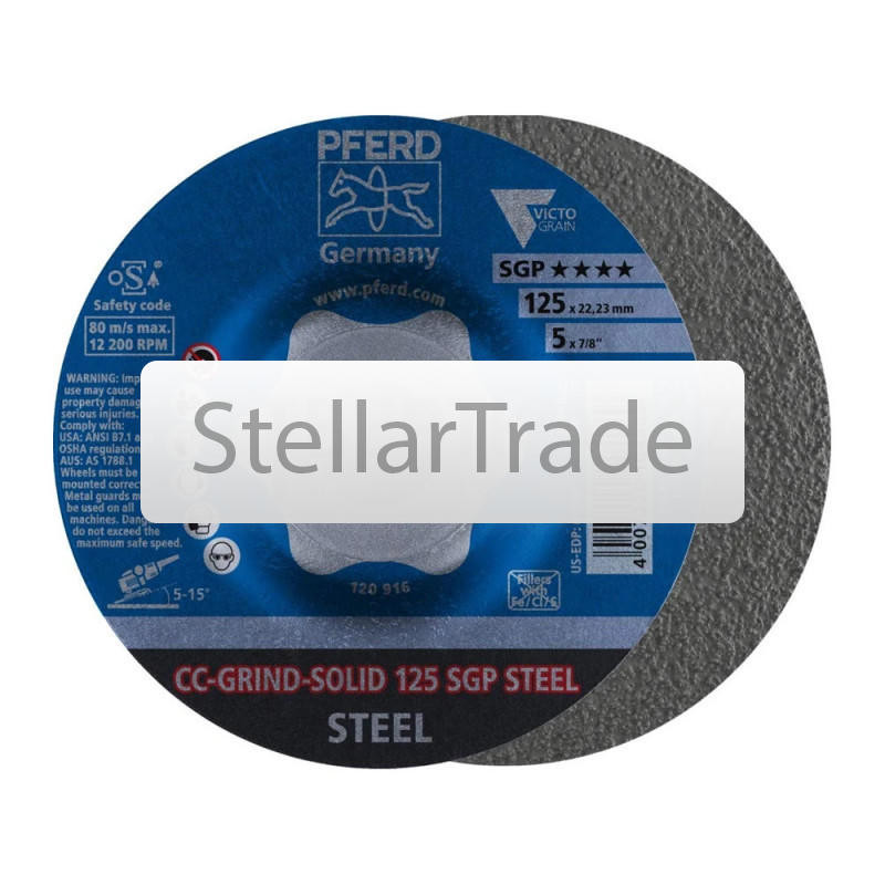 Pferd CC-GRIND SOLID 125 SGP STEEL (64187126) - дисковый шлифовальный круг с треугольным высокопроизводительным абразивным зерном точной формы VICTOGRAIN, предназначенный для обработки стали. Обеспе еще→чивает высочайшие шлифовальные свойства и стабильную производительность при длительной эксплуатации. Преимущества модели Беспрецедентная агрессивность обеспечивает чрезвычайно быстрый
