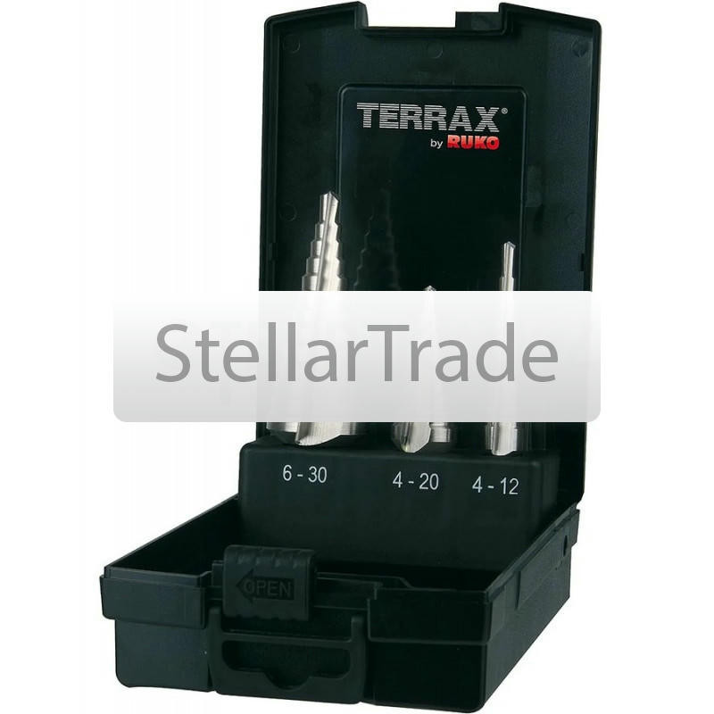 Набор ступенчатых свёрл 4-12/4-20/6-30 мм HSS Terrax by Ruko A101126RO с цилиндрическим хвостовиком (ц/х) изготовлен из качественной быстрорежущей шлифованной стали HSS (аналог Р6М5). Наз еще→начение: сталь прочностью ниже 900 Н/мм2; алюминий; латунь; пластик; бронза; чугун. Предназначены для сверления сквозных отверстий в листовых металлах и пластике, или используется в качестве средства