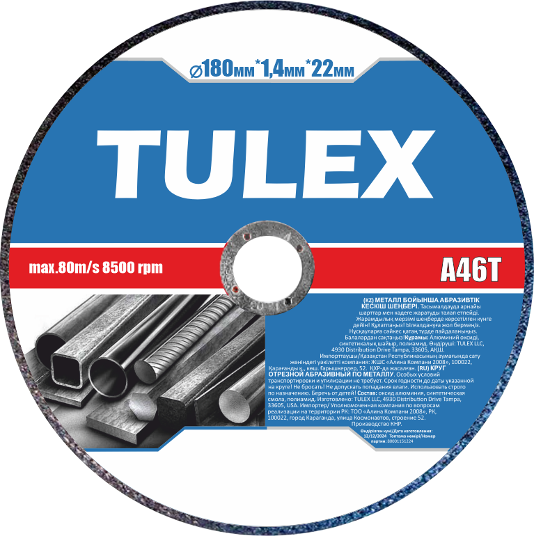 Эффективность работы гарантирована кругом отрезным Tulex диаметром 180 мм — идеальный выбор профессионалов! ✅ Идеален для сухой резки металла без потери качества! ✅ Надежная посадка благодаря диаметру еще→22 мм и толщине 1,4 мм — стабильное удержание инструмента даже при высоких нагрузках. Выбирайте качество Tulex – выбирайте надежность и точность каждой детали!