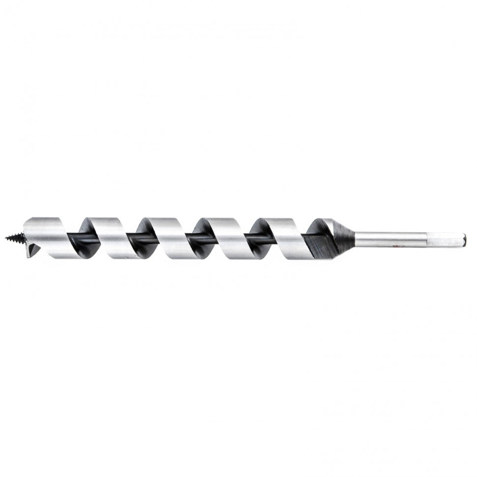 Сверло имеет центрирующее острие со спиральной нарезкой, уменьшающей осевую нагрузку, и острую подрезную кромку, которая позволяет с высокой точностью просверлить отверстие с гладкими поверхностями, п еще→редотвращая смещение сверла и исключая необходимость в предварительном засверливании.Изготовлено из углеродистой стали с твердостью режущей части 40 HRС.Шестигранный хвостовик обеспечивает надежное удержание сверла в патроне.