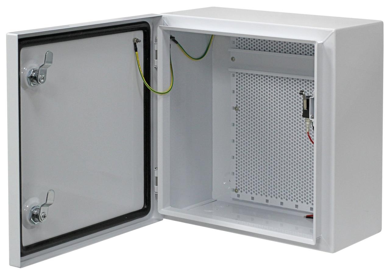 Особенности - Стальной корпус; - Класс защиты IP66; - Дверь, запирающаяся на два замка с ключами; - Датчик вскрытия; - Выбивные отверстия для ввода кабеля; - DIN-рейка для монтажа оборудования; - Перф еще→орированная панель для монтажа электронных плат; - Крепление на стену или столб.
