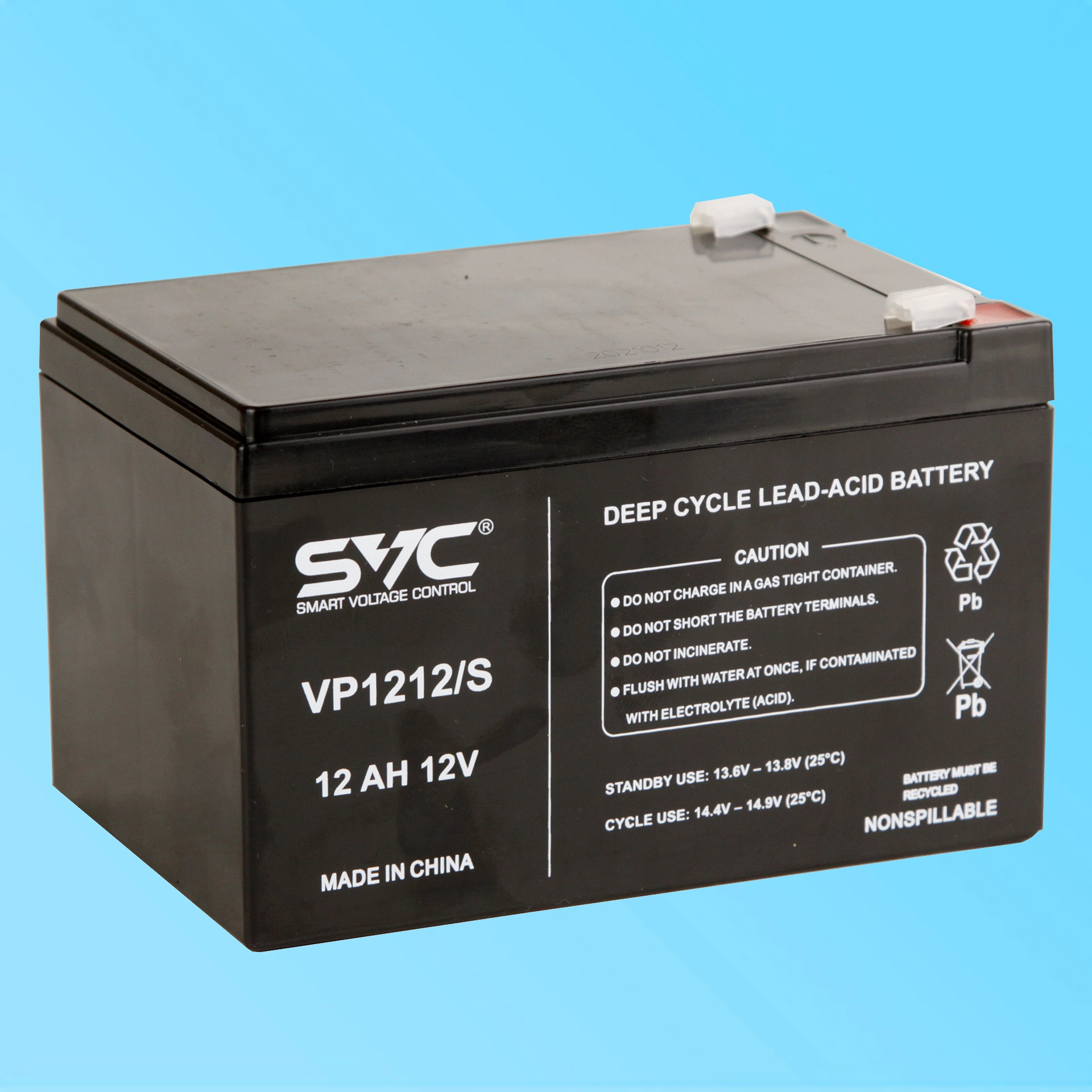 Батареи серии VP от компании SVC Батареи данной серии не обслуживаемые, не требуют доливки воды, предназначены для работы в циклическом режиме (выдерживают до 600 циклов). Низкий уровень саморазря еще→дки обеспечивает срок службы от 2 до 4 лет в резервном (буферном) режиме. Герметичная конструкция позволяет использовать батарею в любом положении. Основная сфера применения данной продукции - источники бесперебойного питания (UPS) любой мощности и конфигурации. Также данные батареи широко используются в пожарном охранном и прочем оборудовании требующем, резервного питания, на сегодняшний день вне конкуренции по соотношению цена/качество.