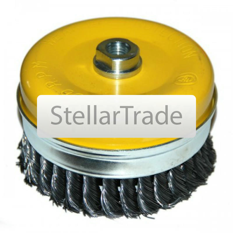 Чашечная щётка с резьбой, неплетёная, стальная проволока. Для работ средней жёсткости на относительно больших площадях, устранение заусенцев, очистки и удаленпия ржавчины. Пр еще→иводные устройства: стационарные машины, углошлифовальные машины. Характеристики Pferd TBU 75/M14 ST 0.30: Производитель Pferd Диаметр 75 мм Рабочая длина 40 мм Резьба М14 Толшина проволоки 0,3 мм Материал проволоки Сталь Рекомендуемое число оборотов 6300-9400 об/мин Вес 312 гр