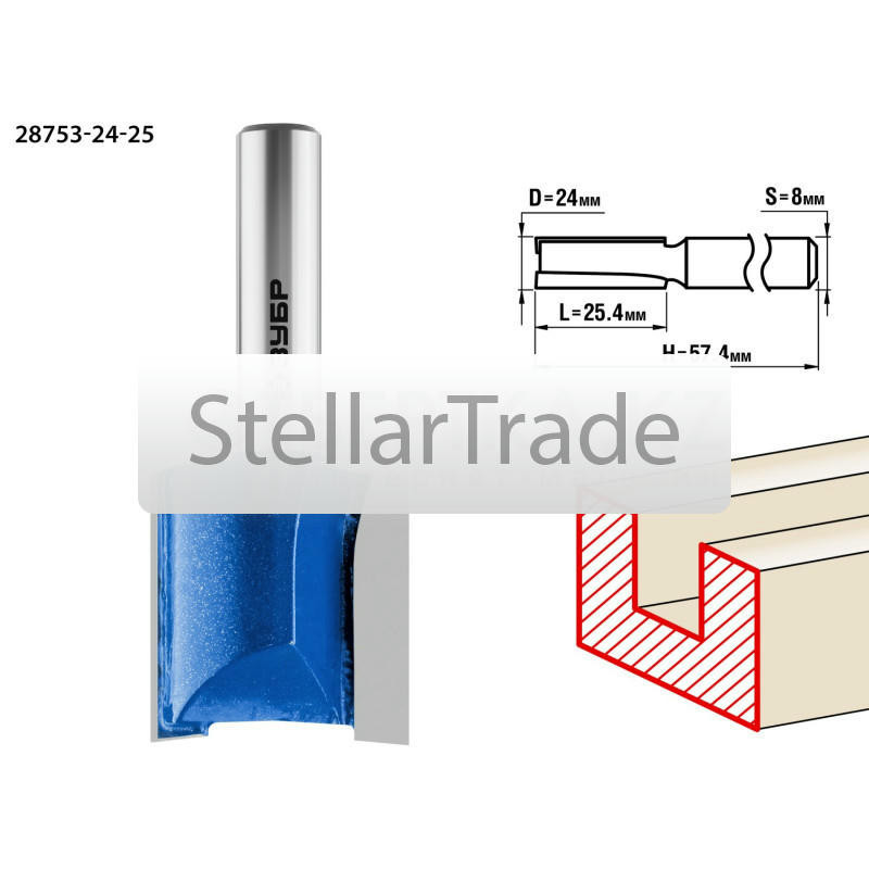 Фреза отлично подходит для изготовления пазов и канавок требуемой конфигурации при работе с различными видами древесины. Преимущества ЗУБР 28753-24-25: Заточка производится т еще→олько на самых современных станках с ЧПУ. Использование ЗУБР 28753-24-25: Используется на фрезерных станках и ручных фрезерах при обработке мебели, столярных изделий, предметов