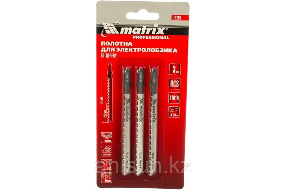 Полотна MATRIX Professional для электролобзика по дереву, 3шт Т101В, 75*2,5мм, HCS 78201 Полотна T101B MATRIX 78201 используются для распила изделий из древесины, ДСП, фанеры, эпоксидных материалов то еще→лщиной от 3 до 30 мм с помощью электролобзика. Полотна изготовлены из высокоуглеродистой стали.