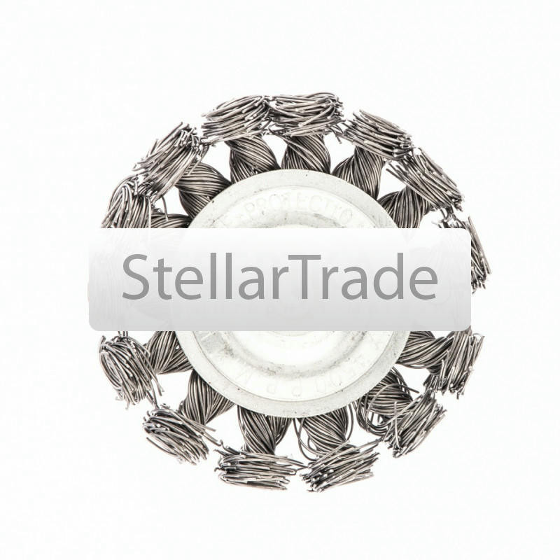 Дисковая щётка с хвостовиком, плетёная, стальная проволока. Для труднодоступных канавок и углублений, для очистки, удаления ржавчины и обработки сварных швов. Плетёная провол еще→ока позволяет работать агрессивней, чем обыкновенная. Рекомендуемый привод: прямая машина, привод с гибким валом, дрель. Рекомендуемая мощность минимум 500 Ватт.