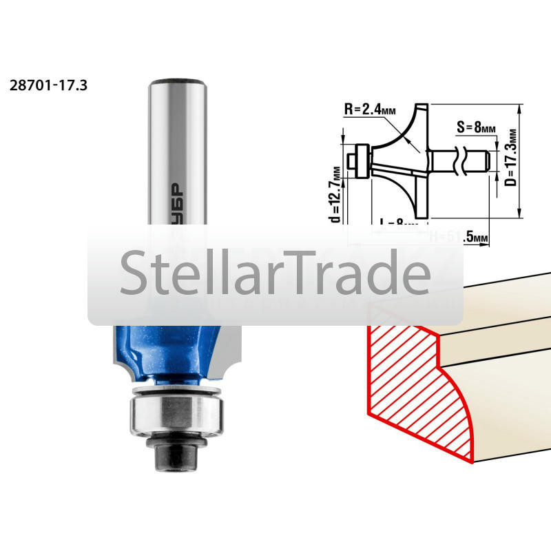 Фреза отлично подходит для скругления кромок при обработке столешниц, полок, шкафов и прочих работ с разнообразными видами древесины. Преимущества ЗУБР 28701-17.3: Заточка пр еще→оизводится только на самых современных станках с ЧПУ. Упорный подшипник позволяет обрабатывать криволинейные кромки без дополнительных приспособлений. Использование ЗУБР 28701-17.3: