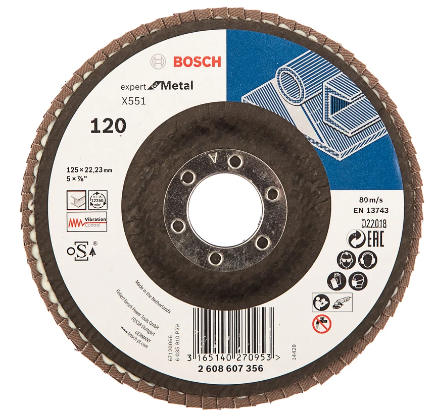 Описание: Лепестковый круг Bosch 2608607356 используется в угловых шлифовальных машинах для обработки металла, также его можно применять и для обработки бетона. Изготовлен круг из прочной Х-ткани еще→, шлифовальный материал — циркониевый корунд, а связующий состав — синтетическая смола, благодаря этому производительность круга высокая. Оснастка в прямом исполнении идеально подходит для шлифования сварных швов с установочным углом (5-15 градусов). Прокладка лепесткового шлифкруга выполнена из стекловолокна. Максимальное число оборотов - 12250 об/мин.