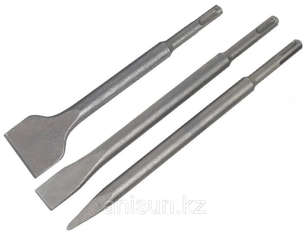 Набор профессиональных зубил с хвостовиком SDS-Plus: острая пика 200 мм; узкое зубило 250 x 20 мм; широкое долото 200 x 40 мм. Набор поставляется в удобном пластиковом тубе.