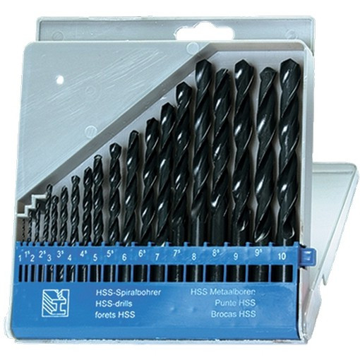 В набор входят спиральные сверла следующих диаметров: 1–1,5–2–2,5–3–3,5–4–4,5–5–5,5–6–6,5–7–7,5–8–8,5–9–9,5–10 мм. Сверла по металлу изготовлены из быстрорежущей стали (HSS). Упакованы в пластиковый пенал.