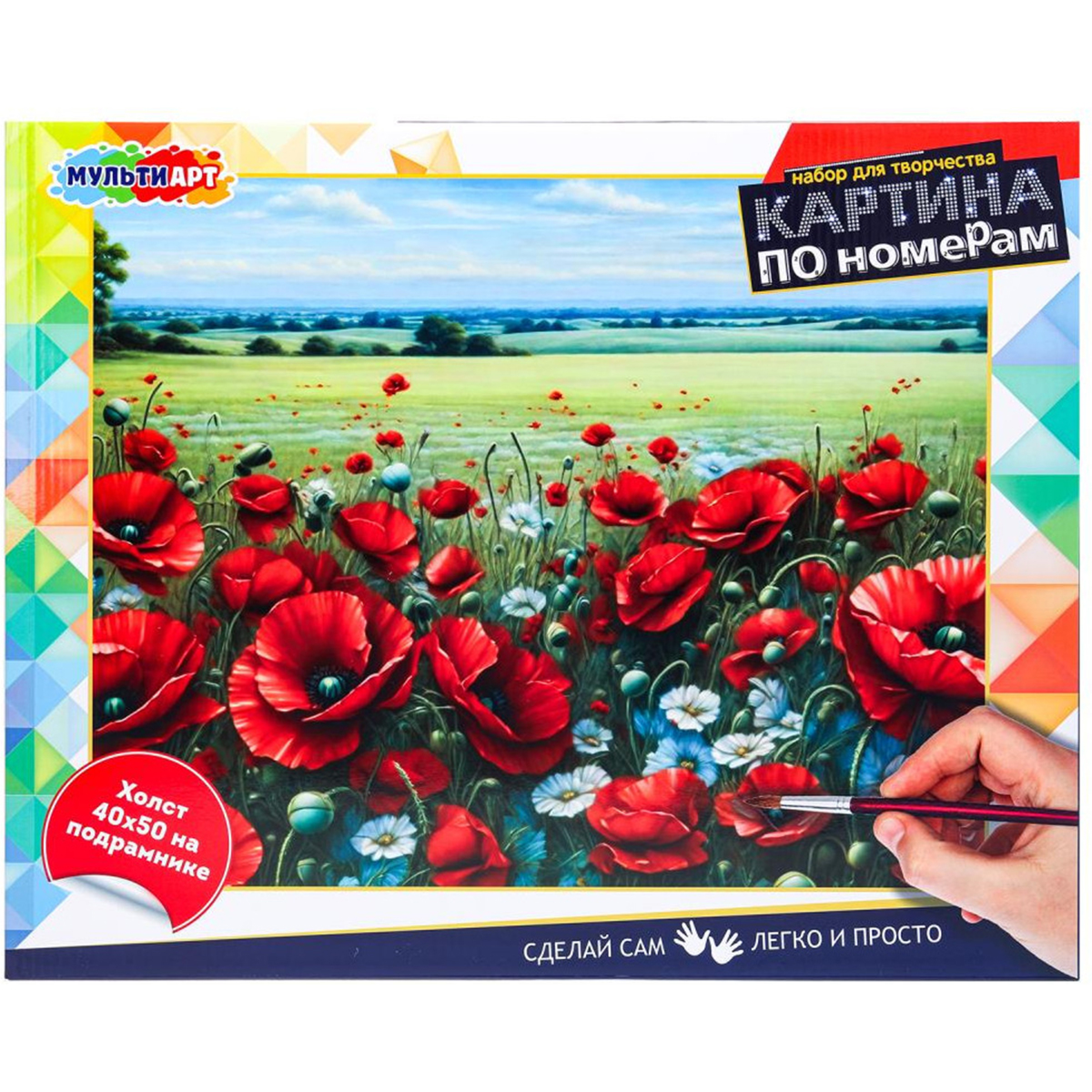 Картина по номерам 40*50 см Маки10 850Купить!тг.Marwin.kzДоставка: из АлматыПожаловатьсяНабор для творчества — картина по номерам «Маковое поле» ТМ «Мульти Арт» — отличный подарок для тех, кто хочет почувствовать себя настоящим художником. Комплектация и особенности: • холст на п еще→одрамнике с нанесённым контурным рисунком; • набор акриловых красок; • кисти; • комплект креплений; • инструкция и рекомендации по использованию на обороте упаковки. Ребёнок увлекательно и с пользой проведёт время, расписывая холст с нанесённой основой и цветовыми подсказками. Готовую картину можно использовать для украшения комнаты или в качестве подарка, сделанного своими руками. Занятия с набором для творчества ТМ «Мульти Арт» развивают: • внимание и усидчивость; • творческое мышление; • сенсорное…