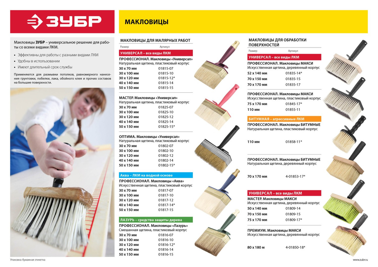 — макловицами называют кисти особой конструкции, отличающиеся короткой ручкой, большой шириной и усиленной впитывающей способностью. Такие кисти слабо пригодны для краски, однако отлично подходят для работы с вязкими и густыми материалами вроде обойного клея. Также макловицы применяют при побелке и грунтовке; особенно они удобны на крупных обширных поверхностях.Выводить