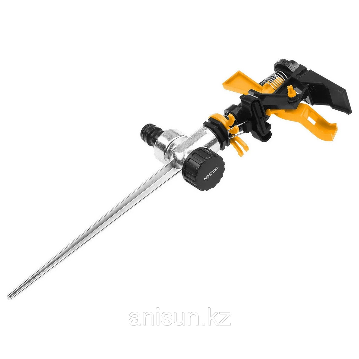 Дождеватель импульсный TOLSEN Ø24м 571303 131Купить!тг. Маркетплейс: Satu.kz Ani-Sun Trade Доставка: по Казахстану ПожаловатьсяДождеватель импульсный TOLSEN Ø24м 57130 - с подключением ½" («БРС-папа») и рабочим радиусом распыления до 24 метров. Этот распылитель предназначен для эффективного полива садов, огородов и сельскохоз еще→яйственных территорий. Прочный корпус обеспечивает долгий срок службы, а надежное соединение с системой полива позволяет контролировать распределение воды на больших площадях. Идеально подходит для использования в профессиональном садоводстве и ландшафтном дизайне.Преимущества:Пластиковый дождеватель с цинковой пикойПолив по окружности или сектораДальность распыления до 24 м в диаметреМатериал: латунь, цинковый сплавКомплектация:Дождеватель 1 шт.Инструкция 1 шт.Упаковка: подвесная карта 1 шт.