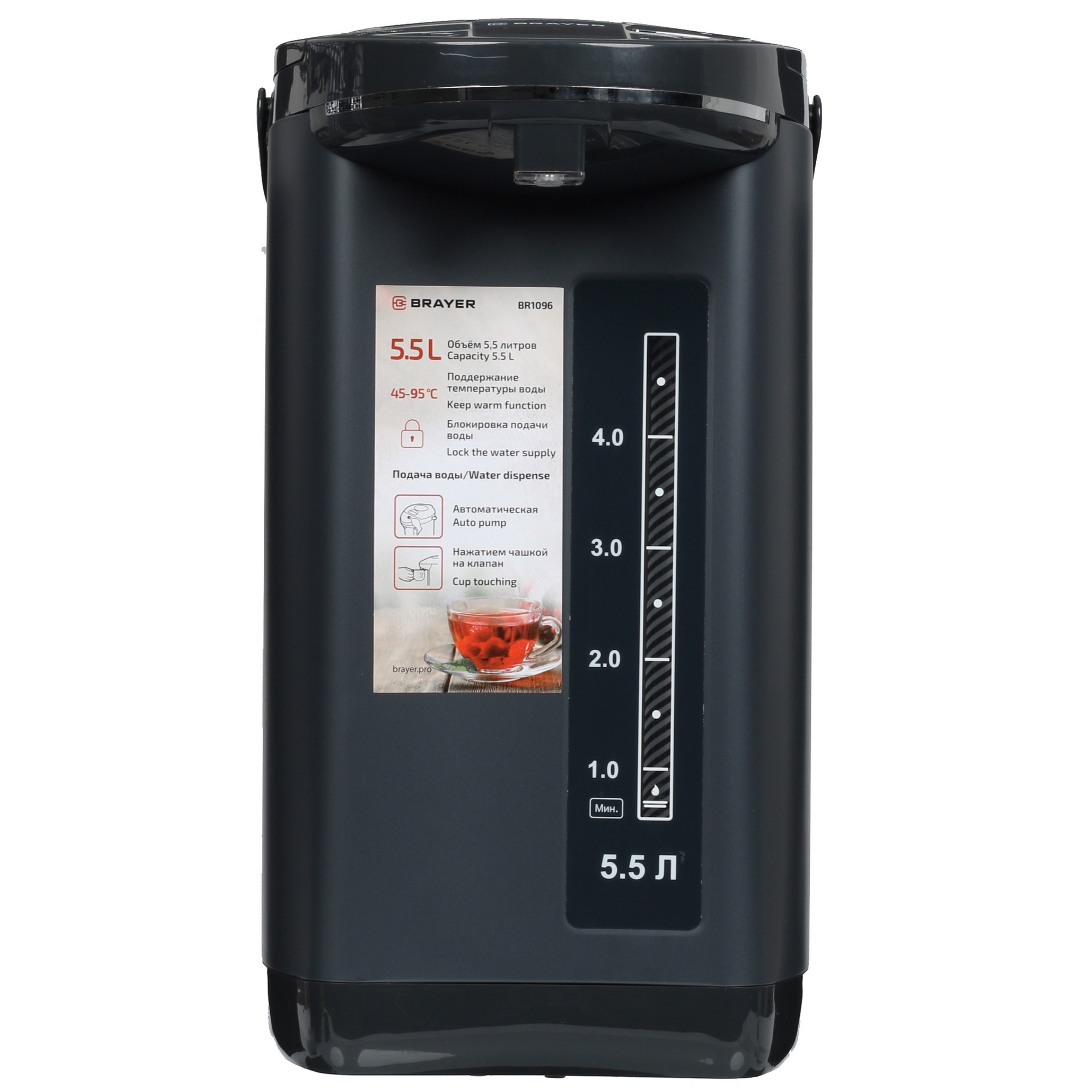 Термопот BRAYER BR1096 (BR1096) черныйТермопот BRAYER BR1096 — мощный и вместительный прибор с объёмом 5.5 литров, выполненный из прочной нержавеющей стали. Поддерживает пять температурных режимов и оснащён дисплеем, защитой от перегрева и отсутствия воды. Благодаря двум способам подачи воды, вращающемуся корпусу и съёмному шнуру питания, устройство обеспечивает удобство и безопасность в повседневном использовании. 55 355 тг.Greenprice.kzДоставка: из АлматыПожаловатьсяКупить!