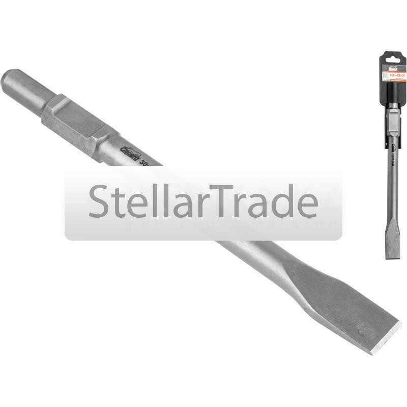 Тип хвостовика: HEXAGON (шестигранник), Диаметр хвостовика, мм: 30, Ширина рабочей части, мм: 35, Общая длина, мм: 400, Марка стали: 60SI2Cr. Пружинная сталь легированная хромом для повышения прочности и износостойкости, Количество в упаковке: 1, Упаковка: индивидуальный подвес с отверстием под крюк. Тип и назначение: для долбления бетона и снятия