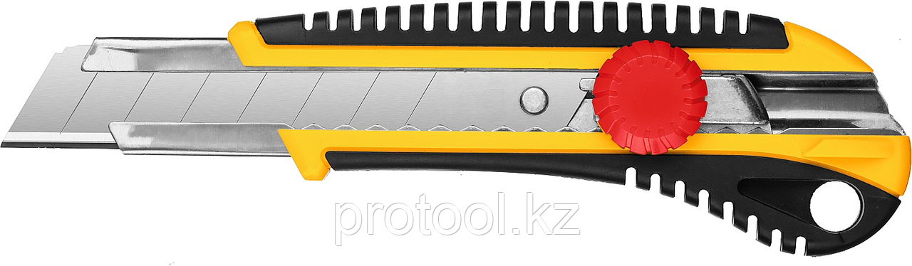 STAYER HERCULES-25, 25 мм, нож с винтовым фиксатором, Professional (09141)1 391Купить!тг. Маркетплейс: Satu.kz Protool.kz - продажа электроинструмента, ручные ст Доставка: по Казахстану ПожаловатьсяПреимущества Усиленный прорезиненный корпус обеспечивает уверенный и надежный захват для реза толстых и прочных материалов Механическая фиксация лезвия обеспечивает уверенный и точный рез Лезвия изгот еще→овлены из стали 65Mn и имеют двойную заточку, что обеспечивает длительный срок службы Описание Мощный нож для многоцелевого использования. Высококачественное острое лезвия и