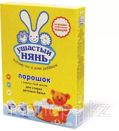 Стиральный порошок 400г Ушастый нянь858Купить!тг. Маркетплейс: Satu.kz ID Shopps.kz - Оптово-розничный Склад Доставка: по Казахстану ПожаловатьсяСМС «Ушастый нянь» начинает действовать уже в процессе замачивания и удаляет загрязнения даже в воде низкой температуры. Эффективно справляется с загрязнениями пигментно-масляного характера: сажа, оли еще→вковое масло, минеральное масло, белкового: кровь, молоко и углеводного: какао, шоколадный крем, каша, трава, а также с пятнами от чая и красного вина на хлопчатобумажной ткани и