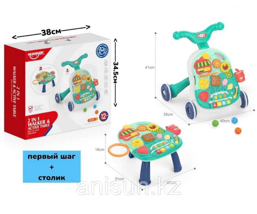 Развивающий центр-ходунки Весёлые шаги YL604A39 686Купить!тг. Маркетплейс: Satu.kz Ani-Sun Trade Доставка: по Казахстану ПожаловатьсяРазвивающий игровой центр легко трансформируется в ходунки, пушкар, столик. Переставив и закрепив в нужном положении ножки каталки и установив сиденье, ребенок сможет кататься как на беговеле. Есть во еще→зможность управления родительской ручкой (в комплекте). Съемная панель крепится на четыре ножки в комплекте и получается столик. Каждый предмет музыкального столика имеет свое