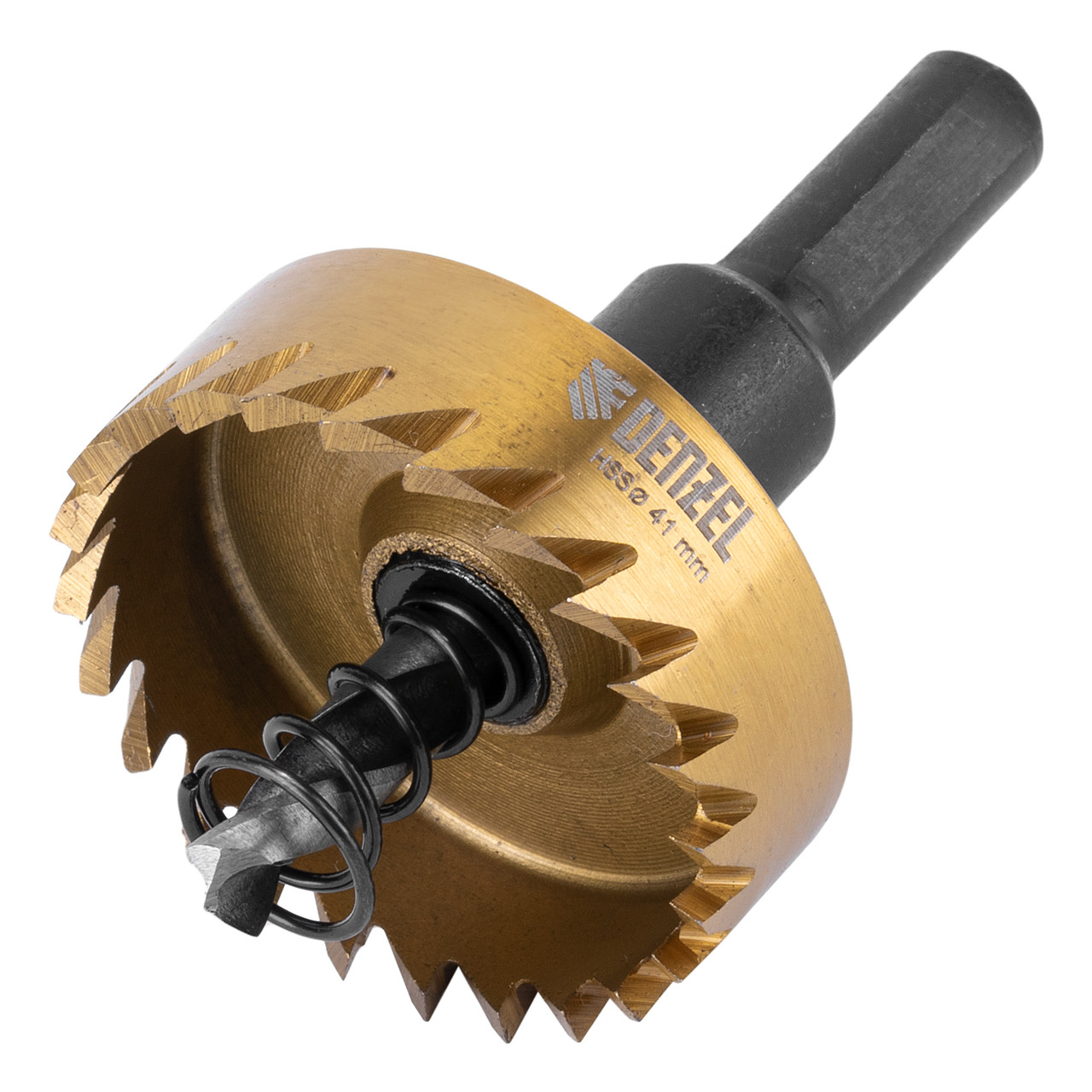 Коронка по металлу HSS, 41 мм, нитридтитановое покрытие Denzel 724113mi3 260Купить!тг.All-tools.kzДоставка: из АлматыПожаловатьсяКоронка Denzel 724113 диаметром 41 мм, из стали HSS, с нитридтитановым покрытием, применяется для сверления отверстий в черных, цветных металлах, пластике и других материалах. Рассчитана на профессион еще→альное использование на строительной площадке. Коронка пригодится при прокладке коммуникаций, монтаже оборудования, крепежных элементов и различных конструкций.ПреимуществаПрочность —