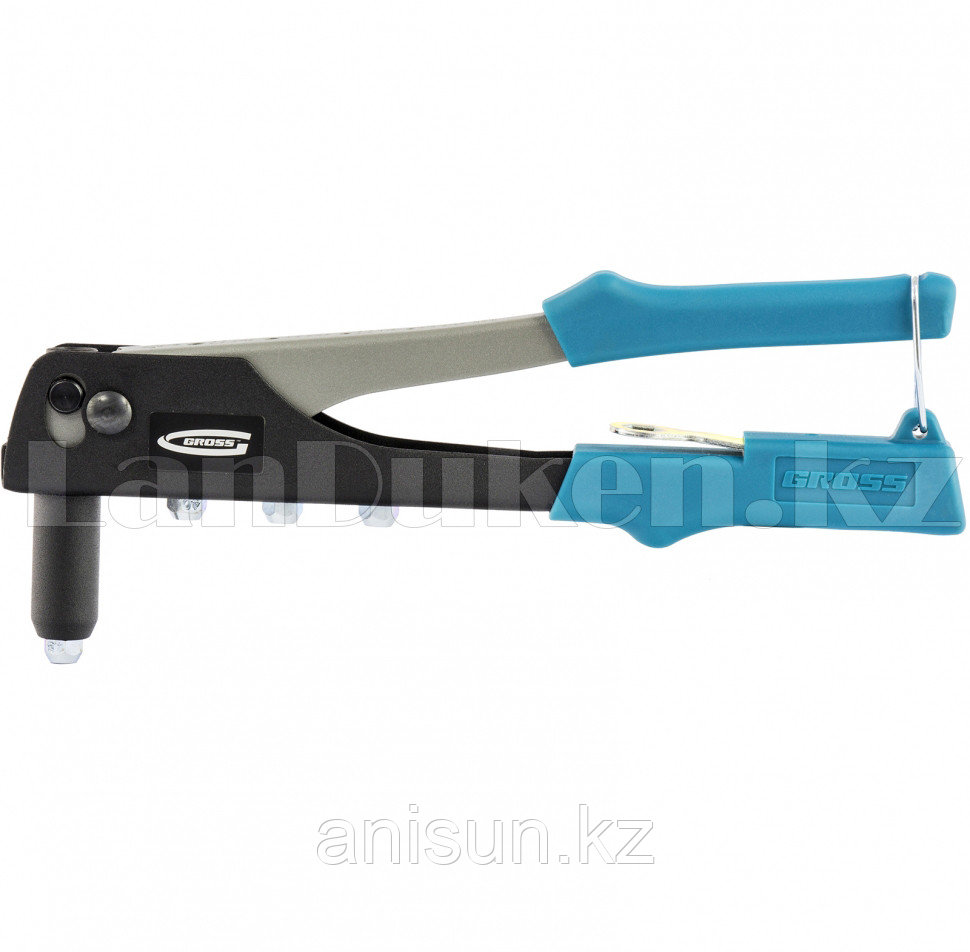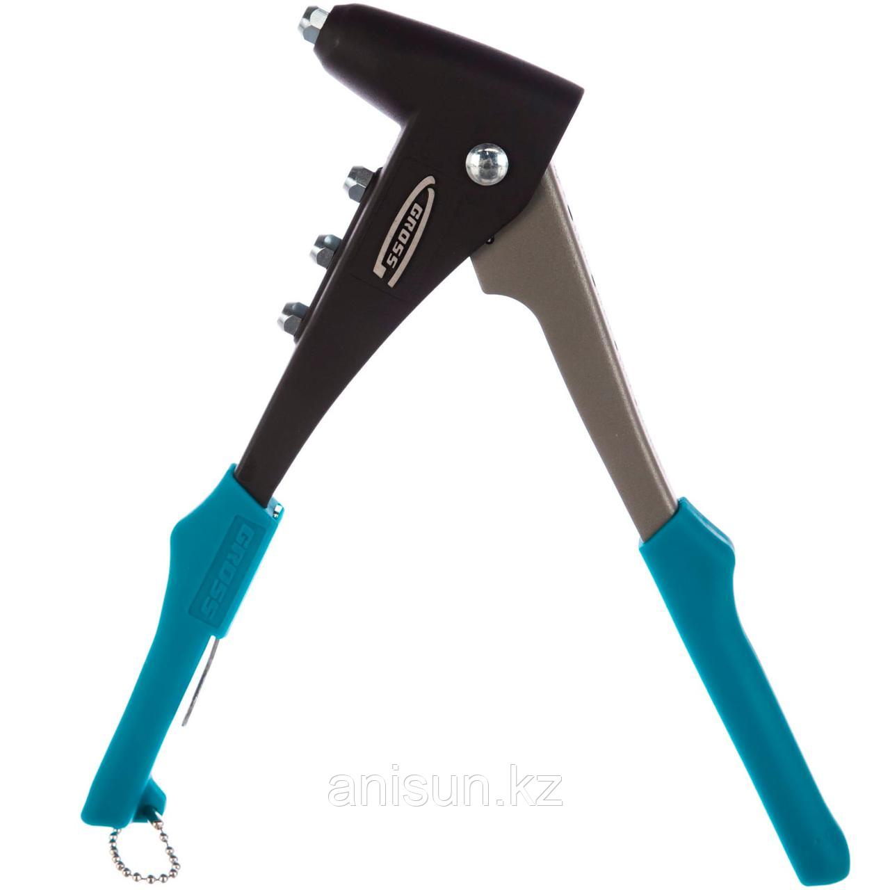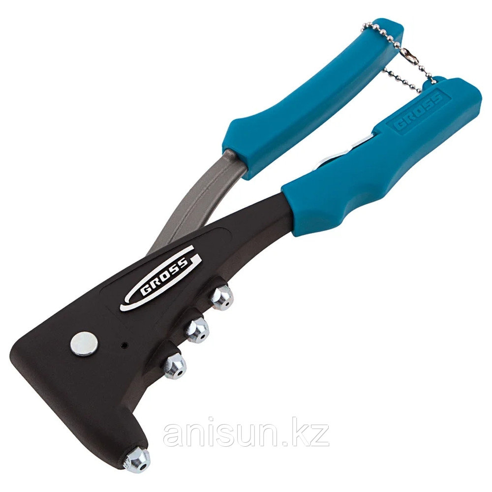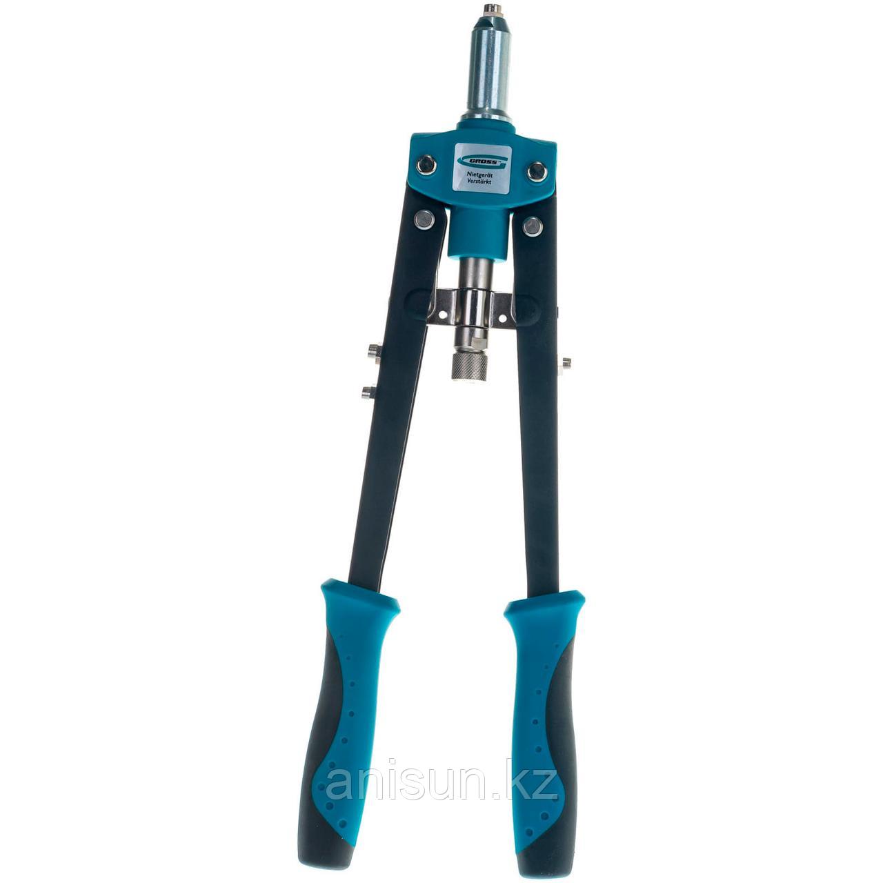 Заклёпочник 258 мм, заклёпки 2,4-4,8 мм GROSS9 511Купить!тг. Маркетплейс: Satu.kz Protool.kz - продажа электроинструмента, ручные ст Доставка: по Казахстану ПожаловатьсяЗаклёпочник 258 мм, заклёпки 2,4-4,8 мм GROSS Заклепочник GROSS предназначен для работ по соединению листового металла, различных тонкостенных конструкций и металлических профилей. В инструменте испол еще→ьзуется цанговый механизм захвата заклепок, изготовленный из хром-молибденовой стали. Рукоятки эргономичной формы изготовлены из термопластичной резины. На оборотной стороне рукоятки