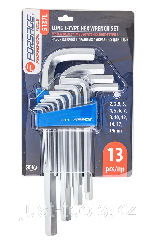 Forsage Набор ключей Г-образных 6-гранных 13 предметов (2, 2.5, 3-8, 10, 12, 14, 17, 19мм)в пластиковом дер. F-51379 620Купить!тг.Just-tools.kzДоставка: из АлматыПожаловатьсяНабор Г-образных 6-гранных ключей Forsage длинных 13 предметов в пластиковом держателе F-5137L(8603). Ровные грани обеспечивают полное сцепление с крепежом. Благодаря удлиненной модели ключи удобно ис еще→пользовать для работы в ограниченном пространстве и труднодоступных местах. Изготовлены из хромованадиевой стали - крепкие и надежные. Выдерживают большую нагрузку. Подходит для