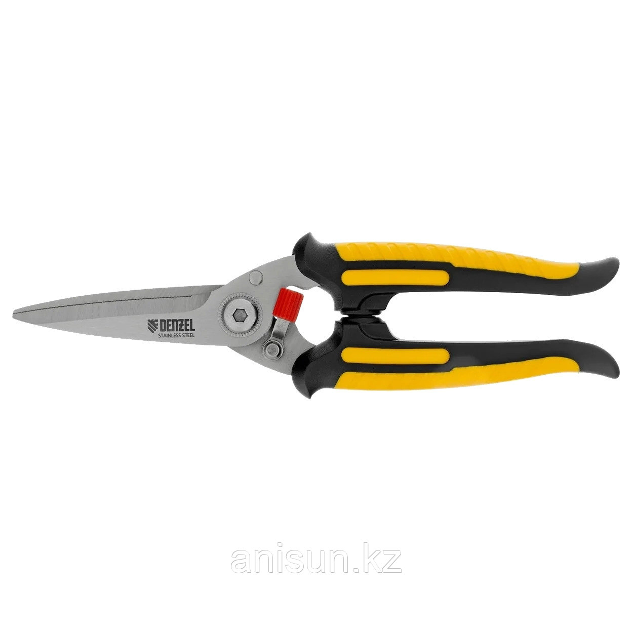 Ножницы универсальные DENZEL 200мм 783198 776Купить!тг. Маркетплейс: Satu.kz Ani-Sun Trade Доставка: по Казахстану ПожаловатьсяНожницы универсальные DENZEL 200мм 78319 - инструмент для разрезания тонкого металла и мягких материалов. Одно из лезвий имеет серрейторную (зубчатую) заточку, поэтому разрезаемый материал не выскальз еще→ывает из инструмента. Ножницы подходят для выполнения разнообразных работ: на даче помогут разрезать стальную сетку с небольшим диаметром проволоки, в походе — ветки или рыбу, во время