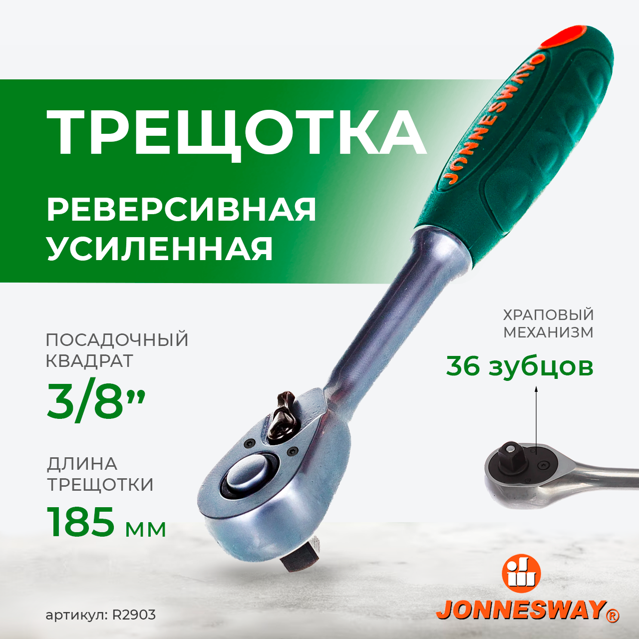 Jonnesway R290313 069Купить!тг.Avtoinstrument.kzДоставка: из АстаныПожаловатьсяОписание: Рукоятка трещоточная 3/8"DR, 36 зубцов, 185 мм Jonnesway R2903 - это ручной инструмент, предназначенный для закручивания гаек как с правосторонней, так и с левосторонней резьбой. Она им еще→еет колёсико шестерёнки с 36 зубцами. Это позволяет осуществлять вращение с 10-кратным приращением. Трещотка отлично подойдёт для работ даже в труднодоступных местах. Особенности трещотки Jonnesway