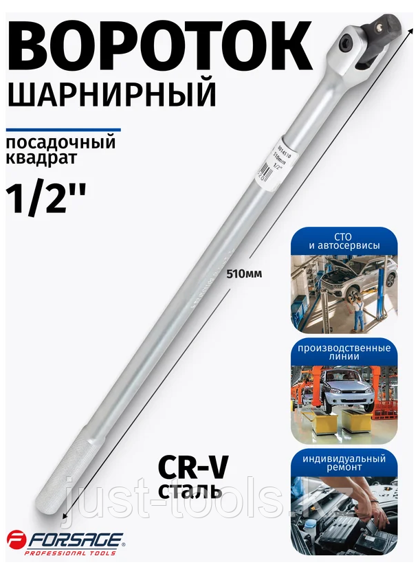 Forsage Вороток шарнирный ударный 510мм, 1/2'' 61960 F-8014510(MPB5 340Купить!тг.Just-tools.kzДоставка: из АлматыПожаловатьсяВороток шарнирный с накаткой 1/2"" (L- 510 мм) имеет рифленую металлическую рукоятку, которая имеет предотвращает проскальзывание руки. Карданный вороток необходим для передачи крутящего момента на т еще→орцевые головки и другие инструменты. Вороток для головок 1/2" шарнирный c металлической рифленой рукояткой обеспечивает надежный захват, без эффекта проскальзывания. Материал воротка