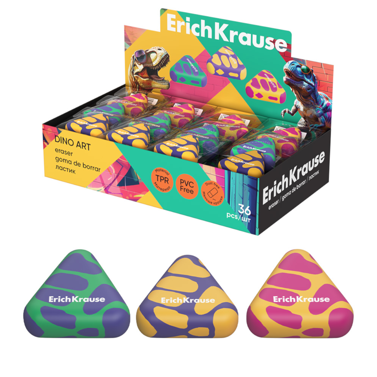 Ластик ErichKrause Dino Art700Купить!тг.Marwin.kzДоставка: из АлматыПожаловатьсяМягкий ластик треугольной формы из современного, экологически чистого и гипоаллергенного материала термопластичной резины (TPR) с пониженным образованием крошек (Dust free). Не содержит ПВХ. Каждый еще→ластик имеет индивидуальный штрих-код. Размер 28 х 26 х 10 мм. Характеристики : - Коллекция: Dino Art - Материал: термопластичная резина - Форма: треугольная - Футляр: нет - Размер, мм: 28 x 26 x 10,5 - Цвет: ассорти Внимание! Товар в ассортименте. Что значит «товар в ассортименте»? Всё очень просто. Это значит, что под одним названием у нас числится несколько похожих товаров. При заказе обязательно укажите желаемый цвет или модель в комментарии к заказу, Фотография мож…