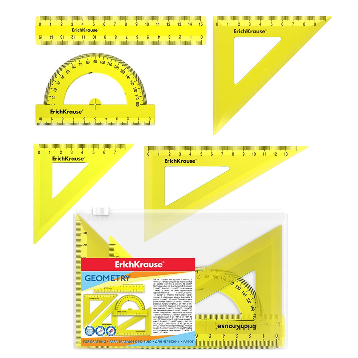 — угольники представляют собой инструменты с форме треугольника с одним прямым углом (90°). Другие углы могут составлять по 45° (у равнобедренных угольников) либо же 30° и 60° — в зависимости от конкретной модели. Применяются такие инструменты для проведения перпендикулярных линий и построения углов.