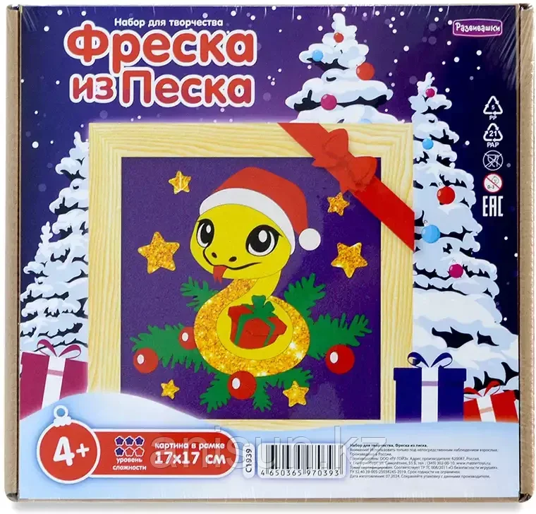 Фреска из цветного песка Новогоднияя змейка блёстки золото С1939768Купить!тг. Маркетплейс: Satu.kz Ani-Sun Trade Доставка: по Казахстану ПожаловатьсяФреска, сделанная своими руками, станет замечательным украшением интерера. Приятным время провождением в процессе которого развивается: мелкая моторика, сообразительность, воображение, аккуратность, л еще→огика, усидчивость и творческие и художественные способности. Состав: трафарет с клеевой основой, деревянная палочка, цветной песок, картонная рамка под дерево.