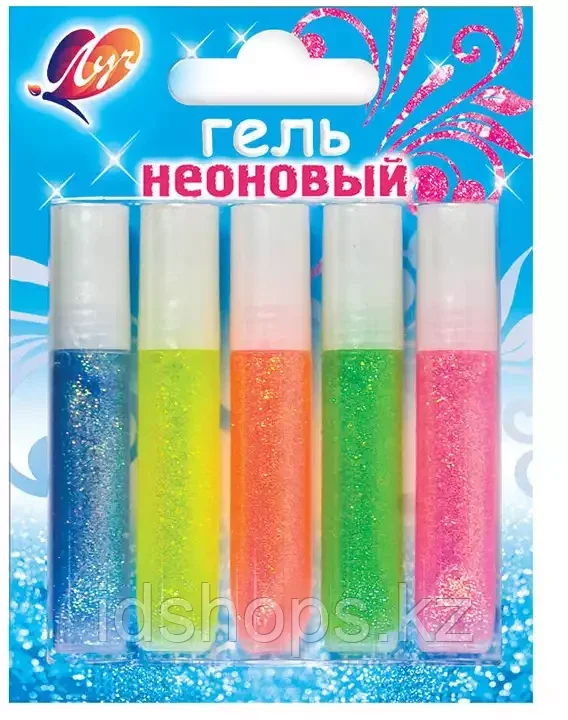 Гель с блестками 5 цветов Неоновый ЛУЧ 12С 886-08858Купить!тг. Маркетплейс: Satu.kz ID Shopps.kz - Оптово-розничный Склад Доставка: по Казахстану ПожаловатьсяНабор 5 цв. по 5 мл.: алый неоновый, голубой неоновый, зеленый неоновый, желтый неоновый, розовый неоновый. Гель предназначен для придания необычных переливающихся эффектов. Используется для украшения еще→рисунков, открыток, поделок из глины, гипса, воска, солёного теста, фольги, стекла и т.п. Легко наностися на любую поверхность, при высыхани становится прозрачным, оставляя на поделке