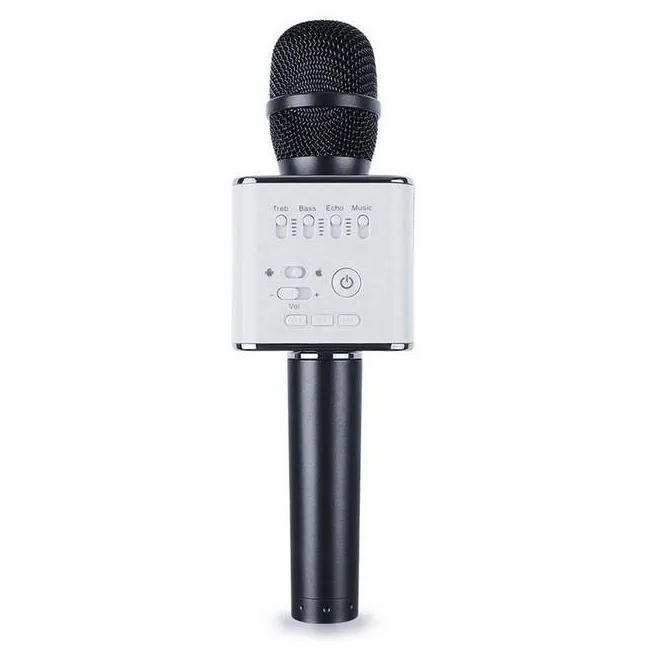 | Портативный караоке микрофон - это новая, ставшая популярной модель функциональной колонки и беспроводного микрофона в одном корпусе. Модель имеет microUSB и USB разъемы, позволяющие подключить внешний накопитель с песнями, и управлять ими прямо с панели микрофона, а также разъём для TF карты. Беспроводной микрофон оснащён встроенной панелью, позволяющей переключать, останавливать, воспроизводить, настраивать эквалайзер и громкость музыки или голоса. | |