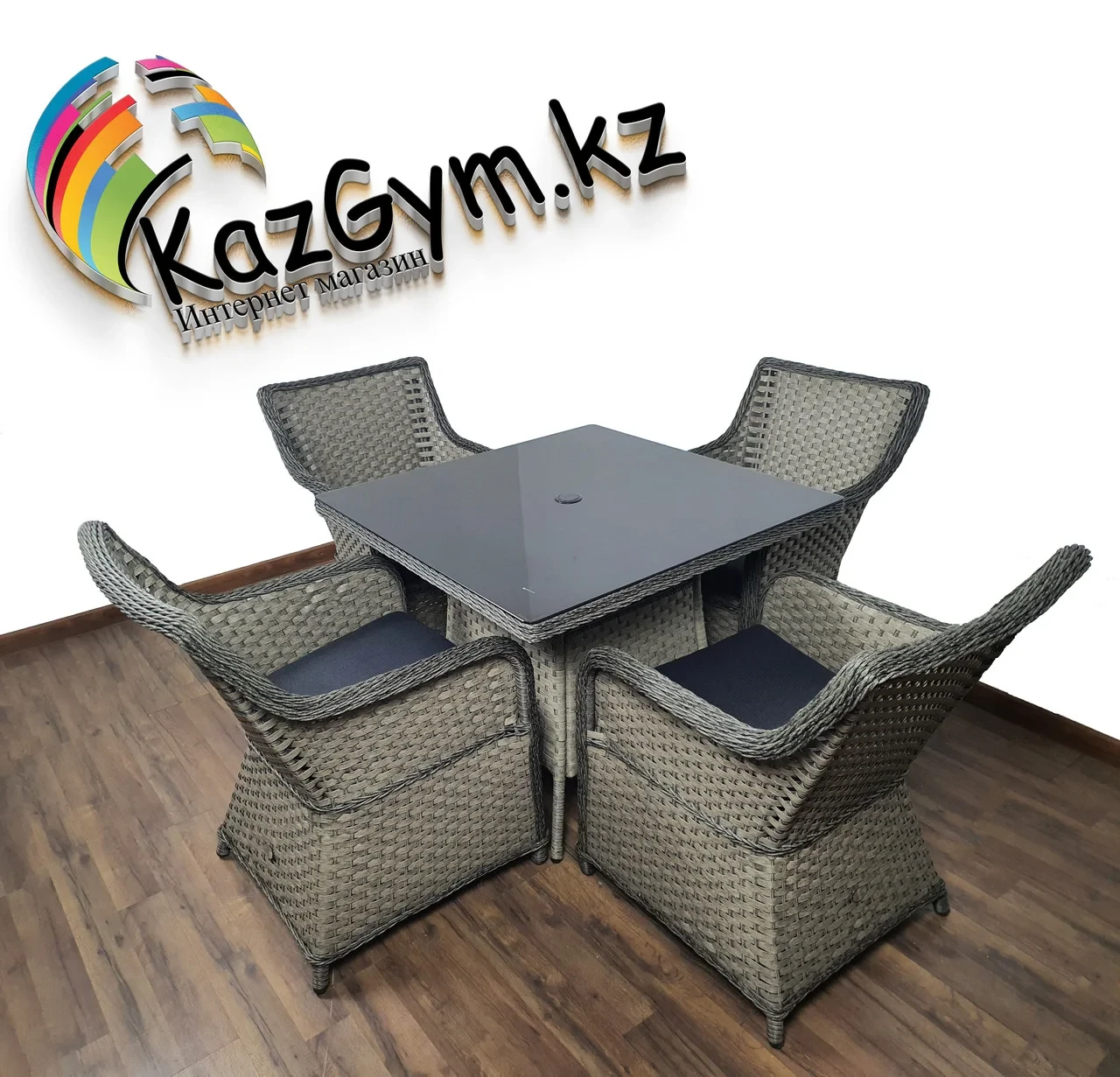 Обеденная группа на 4 персоны "Сарагоса" RTN-059354 990Купить!тг.Pro-komfort.kzДоставка: из АлматыПожаловатьсяУважаемые посетители! Уточняйте, пожалуйста, наличие и стоимость у наших операторов, бывают расхождения! Размеры: Кресла ― 57х65х90, 4шт. Стол ― 90х90х75см, с отверстием для летнего зонта в центре еще→4см. Материал: металл, искусственный ротанг 1 стекла, стекло. Раньше плетеная мебель из ротанга чаще всего встречалась на дачах и открытых террасах. Сегодня комплекты мебели из