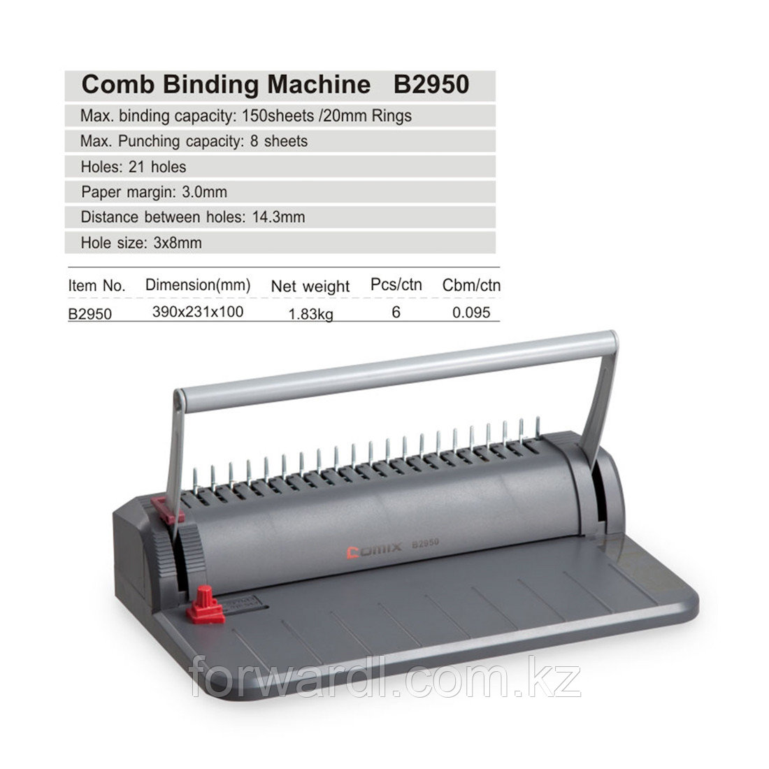 Переплётная машина на пластиковую пружину COMIX B2950, 150л./20мм.16 538Купить!тг. Маркетплейс: Satu.kz ТОО "Forward L" Доставка: по Казахстану ПожаловатьсяПереплётная машина на пластиковую пружину COMIX B2950 Comix B2950 - Персональный переплетчик для создания брошюр формата до А4. Брошюровщик Comix B2988, с регулировкой формата и глубины пробивки. Макс еще→имальное количество листов для переплета 150л., перфорация 8 листов за один раз. Не забудьте, что для работы с брошюратором Comix B2950 требуются расходные материалы: пластиковые пружины, картонные и
