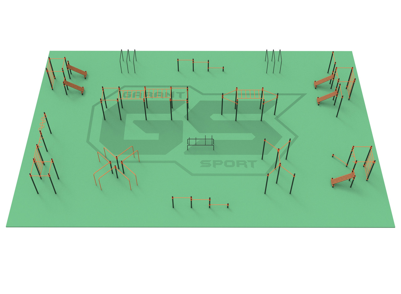Воркаут площадка GS-30283 992 000Купить!тг. Маркетплейс: Satu.kz ТОО "Garant Sport" Доставка: по Казахстану ПожаловатьсяРазмер площадки: 23 х 15 м. = 345 м. кв. Вес/объем оборудования: 1630 кг. / 7 м.куб. Кол-во оборудования, шт.: 9