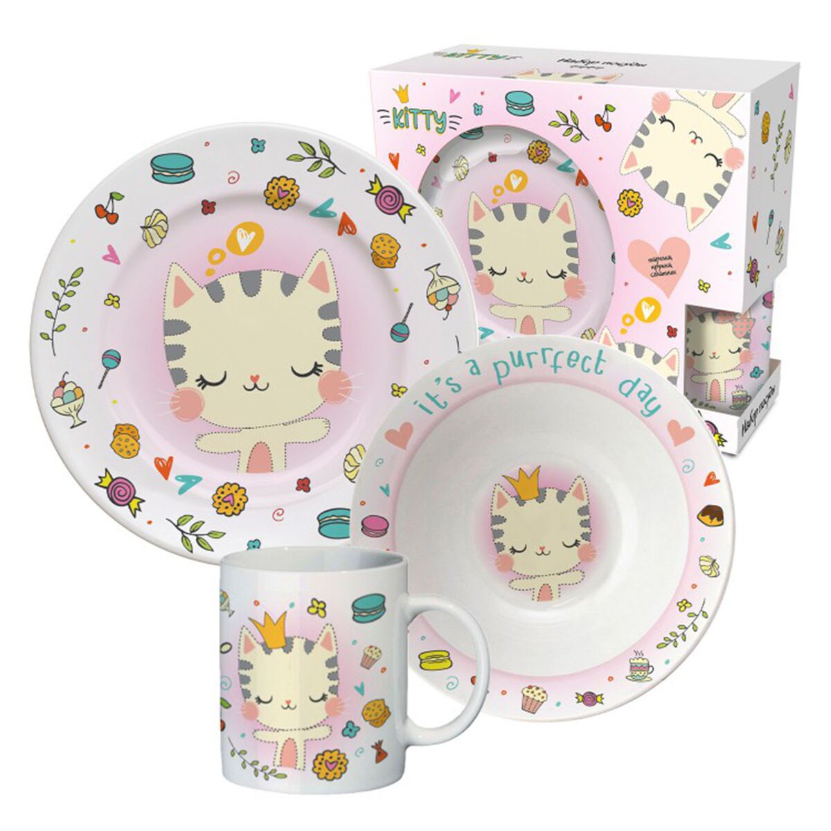 Набор посуды "Кошечка.It's A Purrfect Day", 3 предмета, фарфор5 900Купить!тг.Marwin.kzДоставка: из АлматыПожаловатьсяНабор посуды «Кошечка. It's A Purrfect Day» - отличный подарок ребенку! Набор посуды изготовлен из фарфора, состоит из 3-х предметов: тарелки диаметром 18,5 см, салатника диаметром 17 см и кружки 2 еще→20 мл. Отличается оригинальным дизайном в пастельных тонах с изображением кошечки Kitty. Посуду из фарфора можно использовать для горячих и холодных блюд, мыть в посудомоечной машине и нагревать в СВЧ-печи. Не рекомендуем мыть посуду абразивными моющими средствами и хранить под прямыми солнечными лучами, чтобы рисунок дольше оставался ярким.